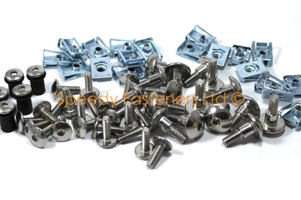 This kit will replace all the quarter turn fasteners with GENUINE Dzus Fasteners plus all the threaded bolts that secure the upper and lower main fairings and rear fairings. This kit also replaces all the necessary clips well nuts and washers including the screen bolts and well nuts.