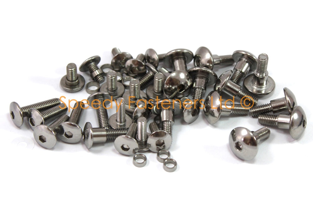 This kit features high quality Stainless Steel Pan Head Bolts with a head diameter of 13.5mm (m5), 14mm (m6) and large (18mm diameter) headed shoulder bolts. These bolts are Stainless Steel which are better than standard OEM zinc plated bolts as they won't rust and have a shine that lasts for years.